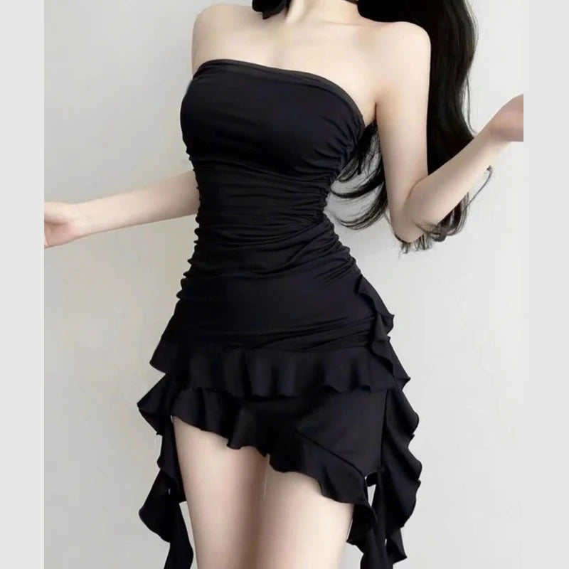 Sexy Irregular Strapless Black Dress Women Summer Backless Ruffles Dresses