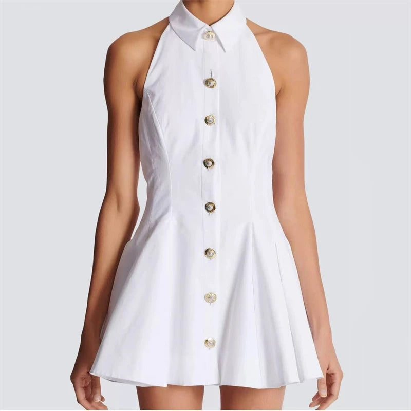 Summer New Women's Pure Cotton Halter Neck Sleeveless Backless Dress High Quality 3D Tailoring Pleated Flared Large Hemline