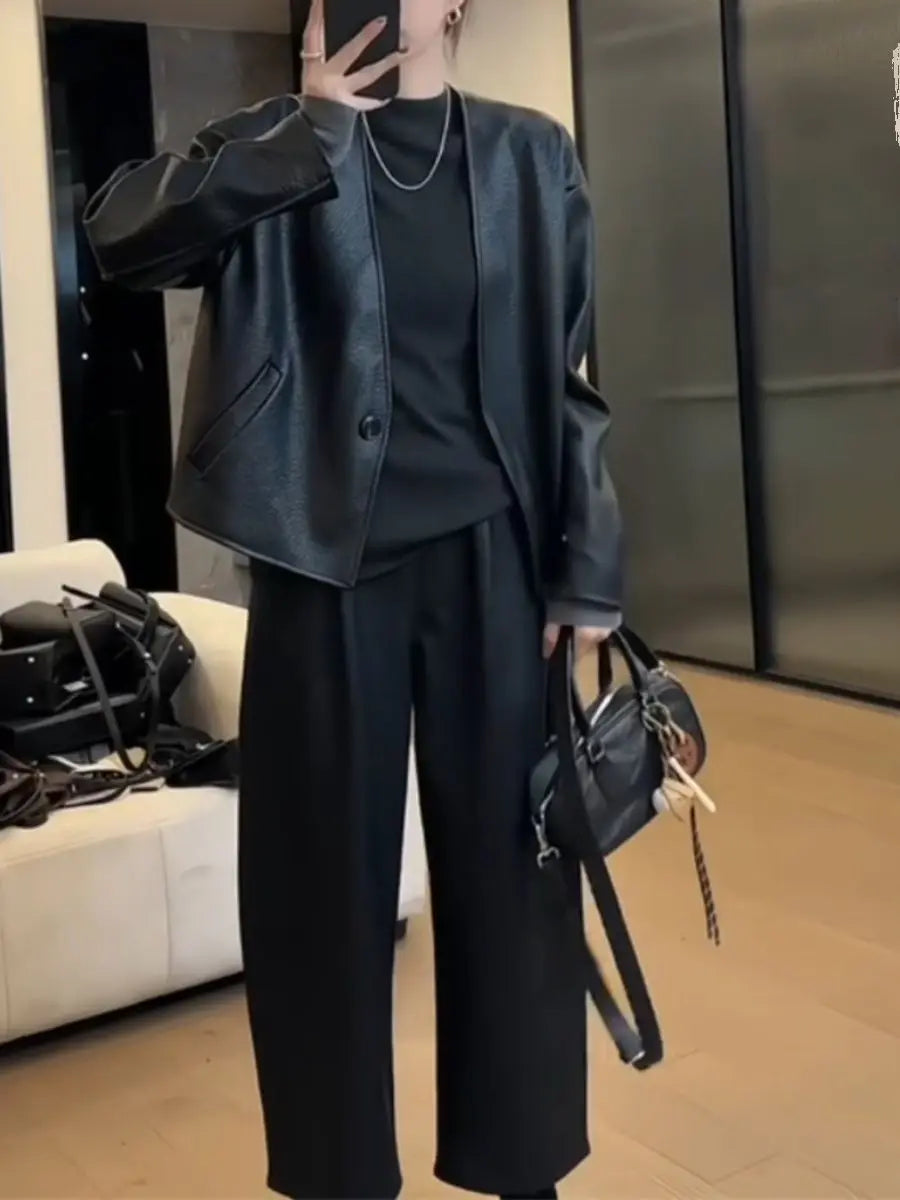 The New Autumn Collection Features Simple Casual Leather Jacket for Women with Short Lapel and Stylish and Individualistic Style