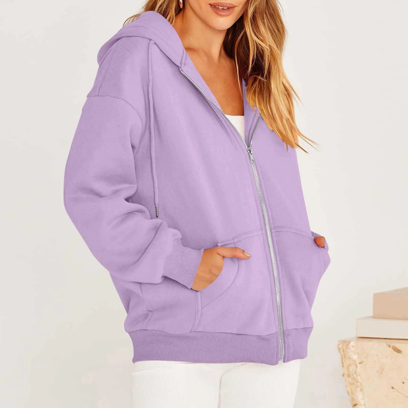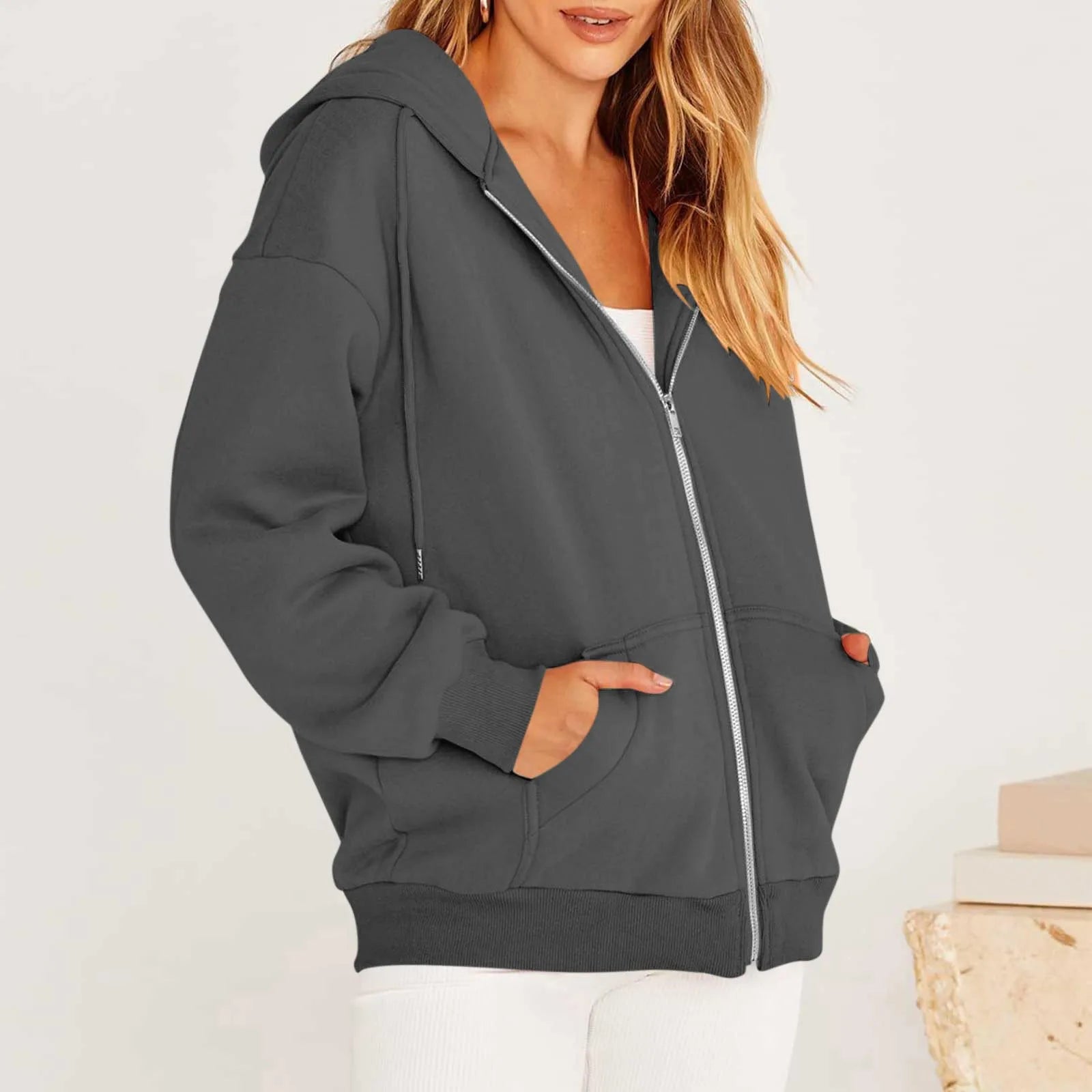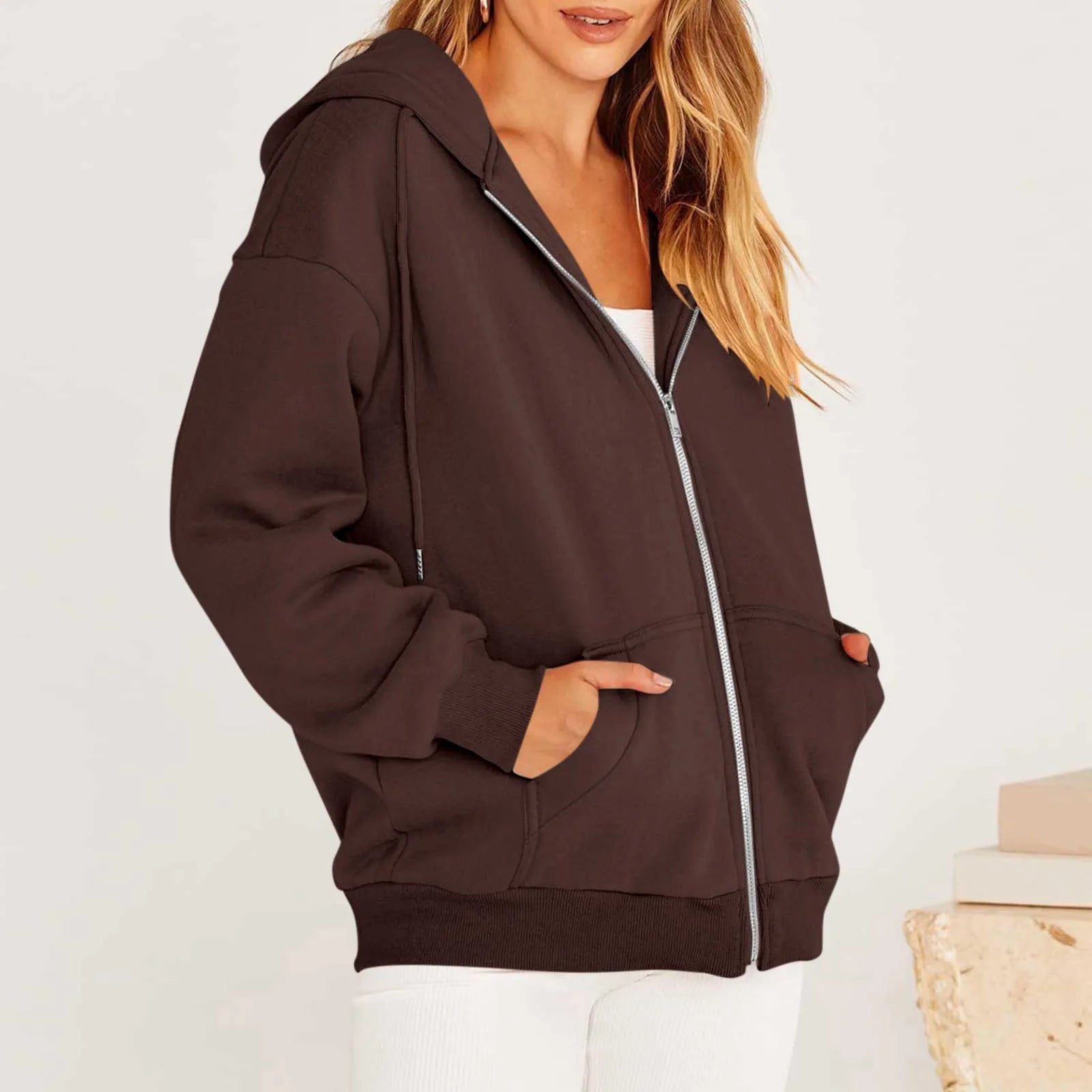 Women's Casual Fashion Solid Color Long Sleeved Zippered Hooded Sweatshirt