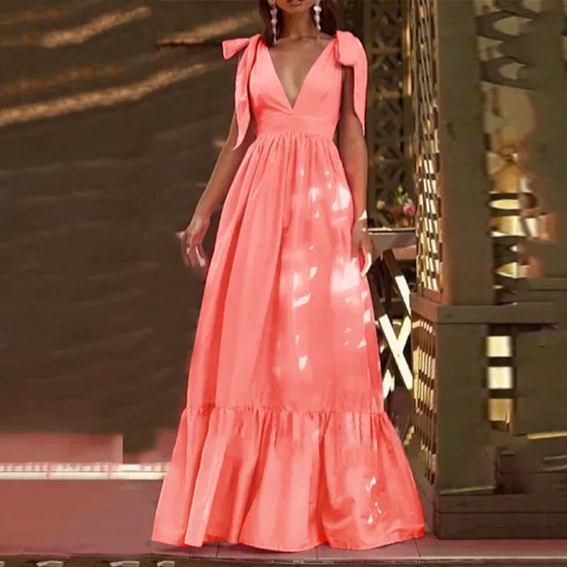 Sexy Summer Women V-Neck Sling Backless Dress Elegant Hollow Out BowKnot Long Party Dress Fashion Femme Dot Maxi Dress Vestido